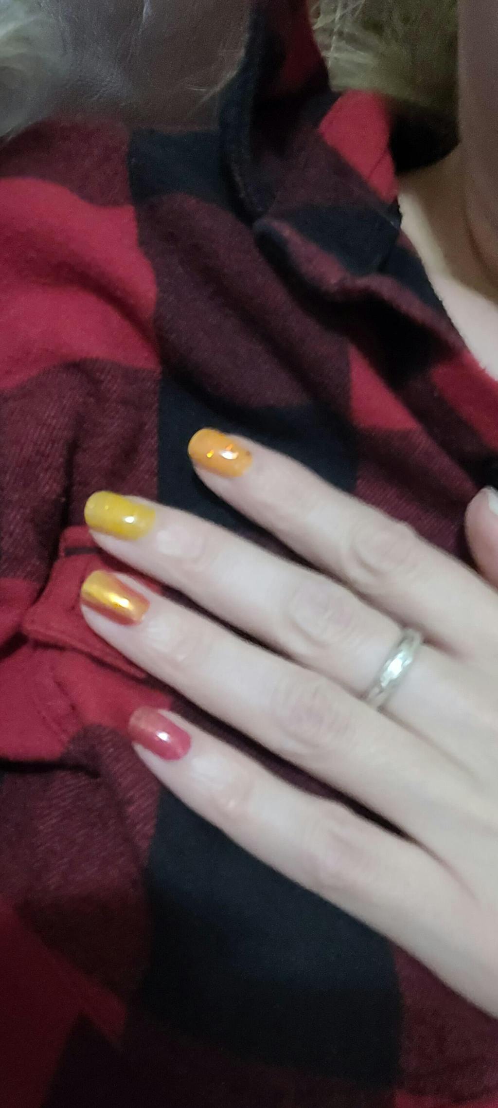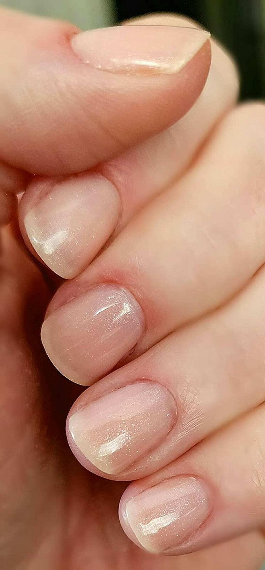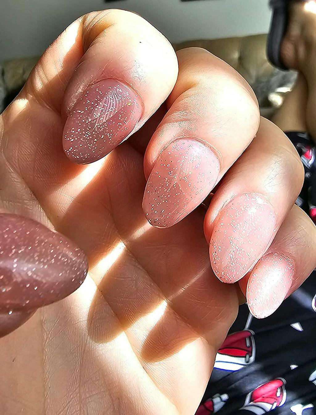 - The nude-toned color is littered with gold glitter that reflect and twinkle no matter where the light catches the nail.
